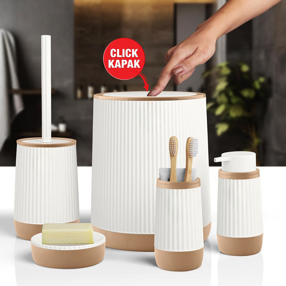 STOK KODU : OKY-1416 ÜRÜN KODU : OKY-385-9-B NİDA 5’Lİ BANYO SETİ(BEYAZ) KOLİ İÇİ ADEDİ : 8 ÖLÇÜ : Çöp Kovası 19*19*25 El Sabunluk 111,5*11,5*4 Sıvı Sabunluk 7*7*15,5 Pamukluk 7*7*12 Wc Fırça 10,5*10,5*35