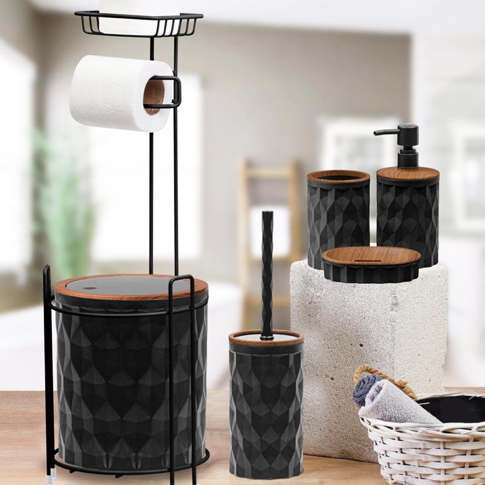STOK KODU : OKY-1731 ÜRÜN KODU : DMD-0131 YUV. WC KAĞITLIK 6’LI SET DİAMOND AHŞAP/SİYAH KOLİ İÇİ ADEDİ : 6 ÖLÇÜ : Yedekli Wc Kağıtlık & Çöp Kovası 20*20*65 Pamukluk 8,5*8,5*12,5 El Sabunluk 12,5*9*3 Sıvı Sabunluk 8*8*19 Wc Fırçalık 10*10*36,5