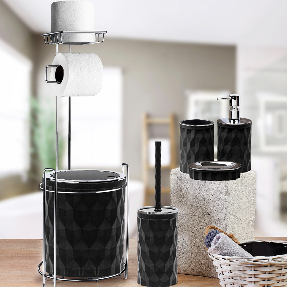 STOK KODU : OKY-1741 ÜRÜN KODU : DMD-0141 YUV. WC KAĞITLIK 6’LI SET DİAMOND KROM/SİYAH KOLİ İÇİ ADEDİ : 6 ÖLÇÜ : Yedekli Wc Kağıtlık & Çöp Kovası 20*20*65 Pamukluk 8,5*8,5*12,5 El Sabunluk 12,5*9*3 Sıvı Sabunluk 8*8*19 Wc Fırçalık 10*10*36,5